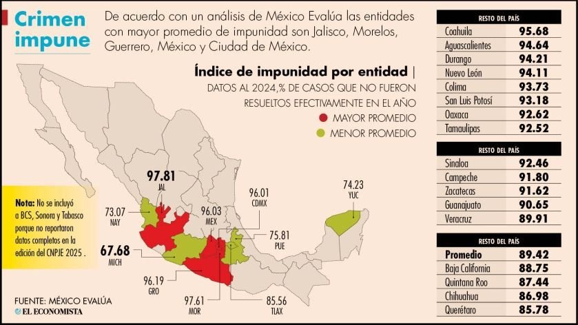 La brecha entre Michoacán y otras entidades es abismal. Mientras que el estado michoacano mantiene un índice de 67.68 por ciento, estados como Jalisco registra 97.81 por ciento, Morelos 97.61 por ciento y Guerrero 96.19 por ciento de impunidad. Esta diferencia de casi 30 puntos porcentuales evidencia la magnitud del trabajo realizado en Michoacán.