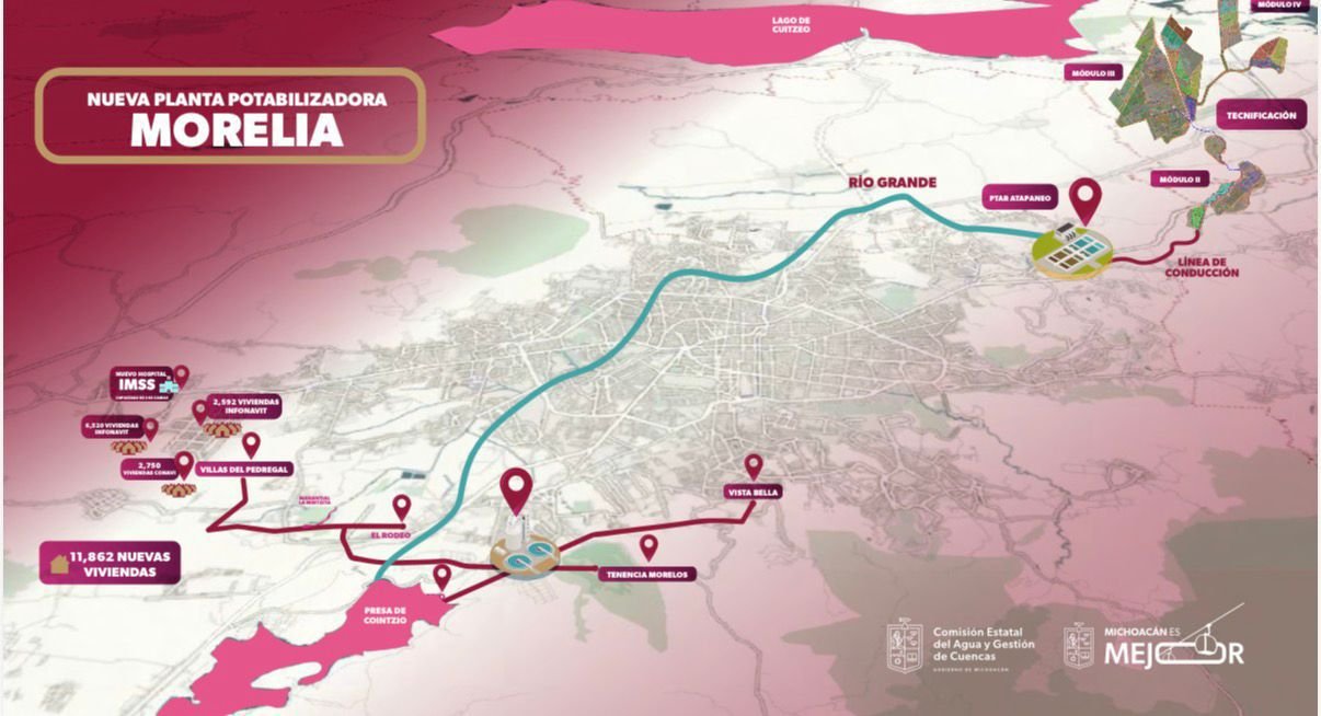 Ubicada en la tenencia Morelos, sobre un terreno donado por el Gobierno estatal, la planta ya fue presentada a la presidenta Claudia Sheinbaum Pardo. En su primera etapa, potabilizará 250 litros por segundo, sustituyendo la unidad actual en colonia Vista Bella y extendiendo una línea de conducción desde la presa de Cointzio hacia la zona oriente de la ciudad.